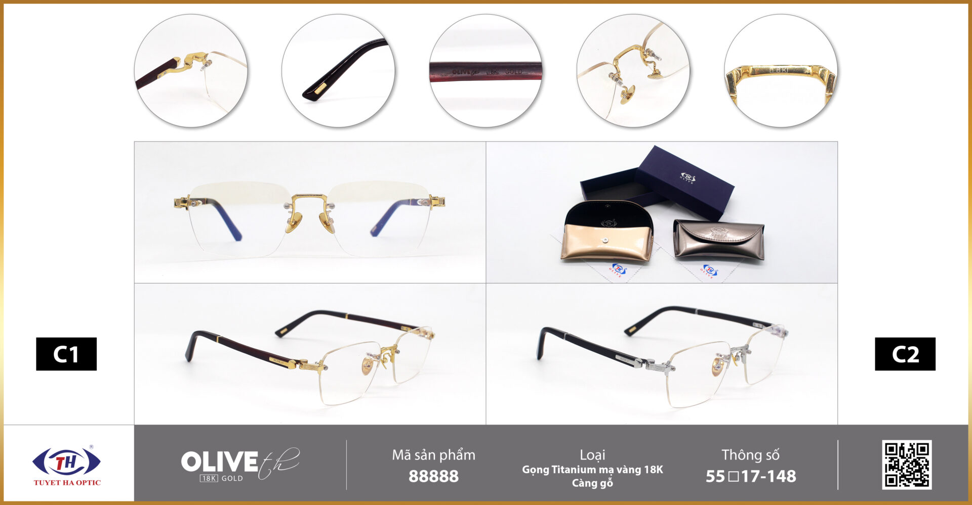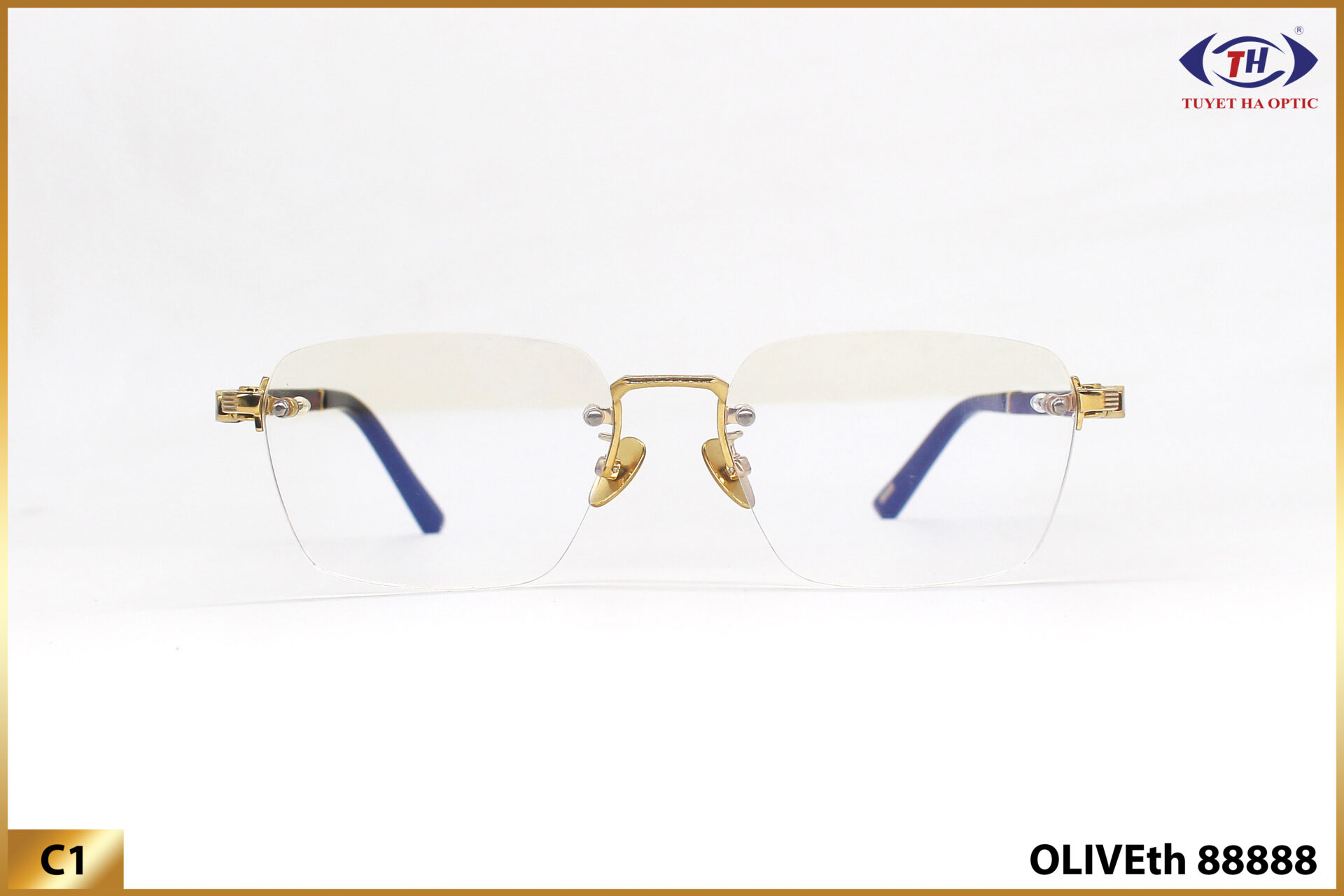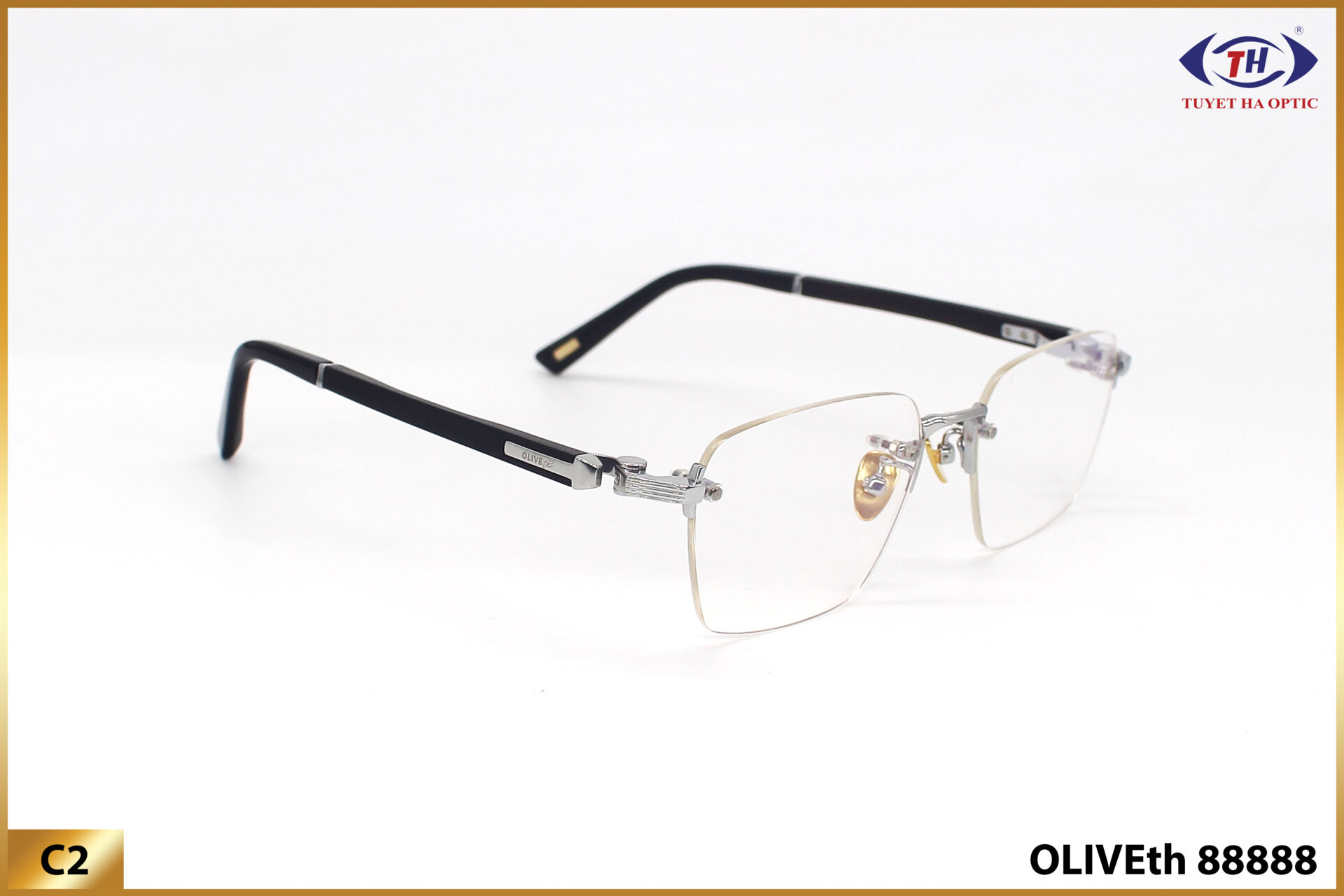 Gọng kính cao cấp đến từ Công ty Tuyết Hà mang thương hiệu Olive là dòng kính cận có chất liệu Titanium nguyên khối được mạ vàng 18k. Mang lại sự sang trọng, đẳng cấp và phong thái bậc nhất dành cho các quý ông quý bà.